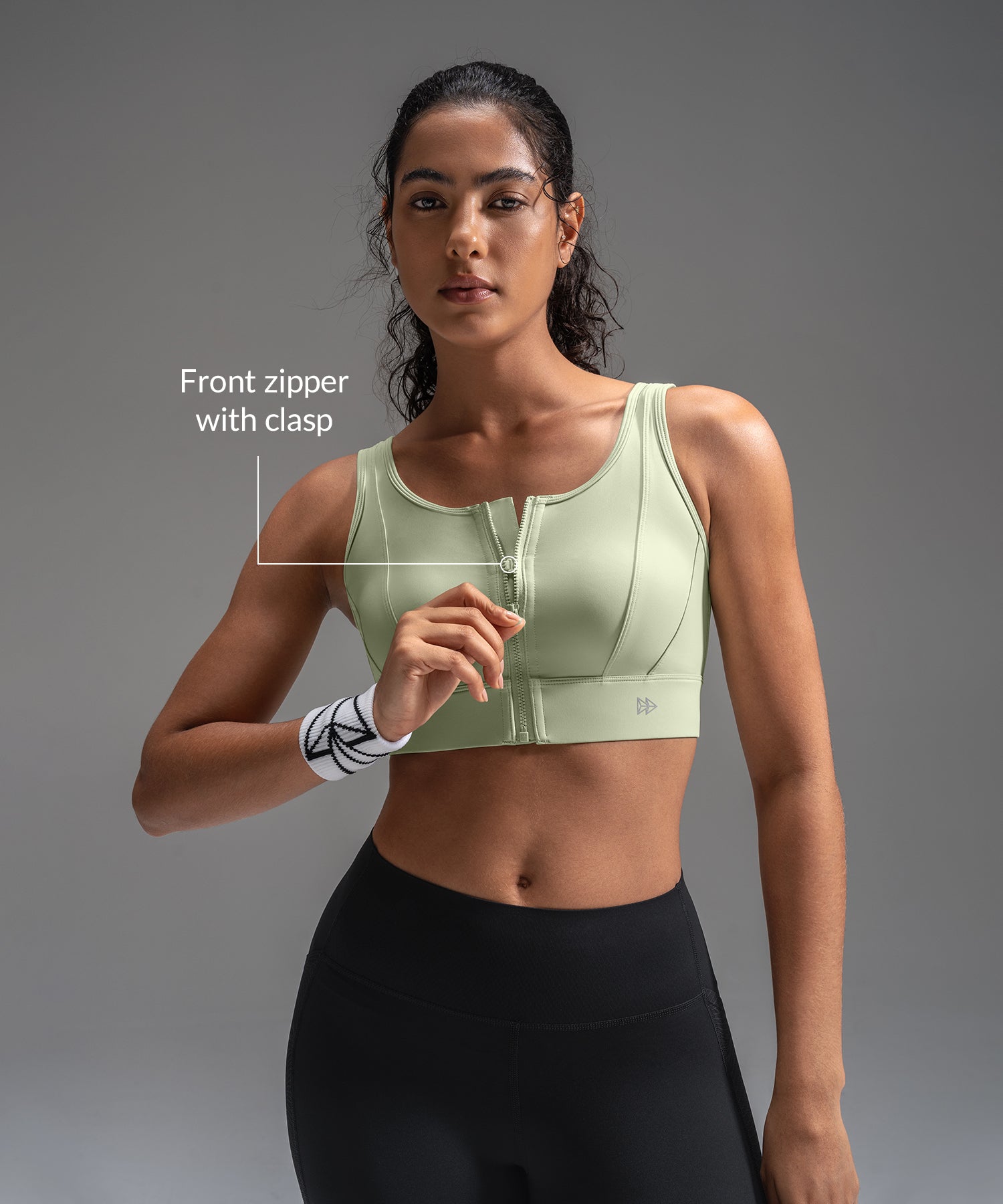 • Front zipper with secure hook stays in place during workouts